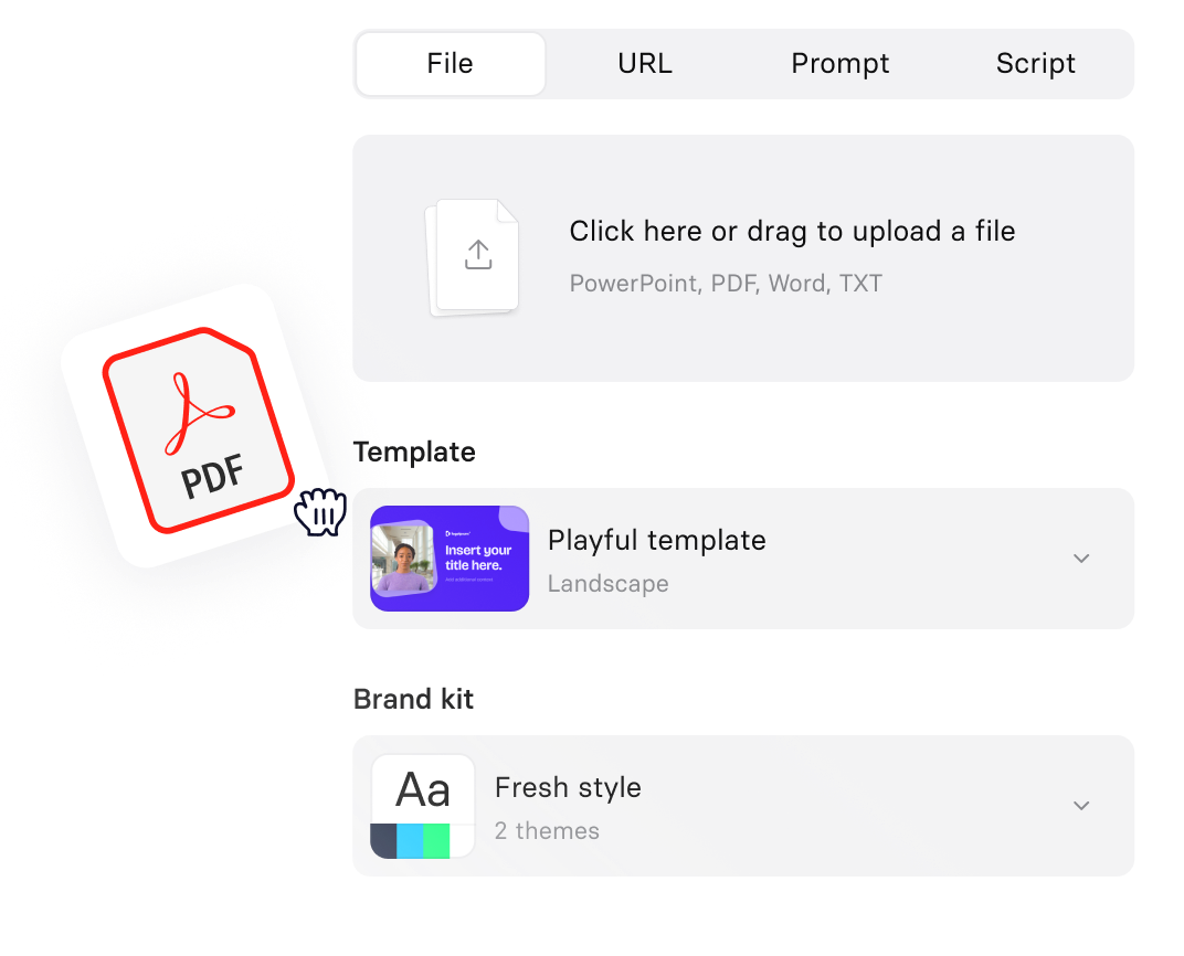 Automatically transform your existing documents, links, or ideas into AI videos that match your brand style.