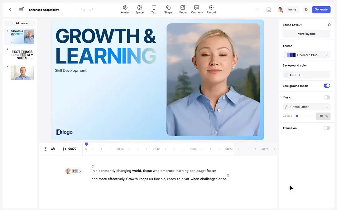 AI videos created with Synthesia allow companies to be agile and consistent in all types of internal communications and training. It is an engaging format that can be easily updated, translated and customised which all in all fosters a more informed, skilled, and motivated workforce, driving the success of the organization's learning initiatives and productivity.